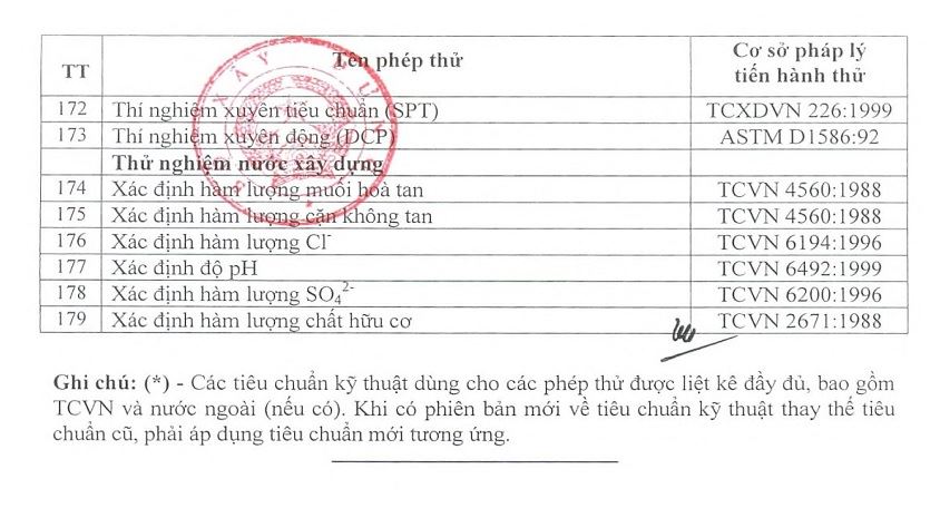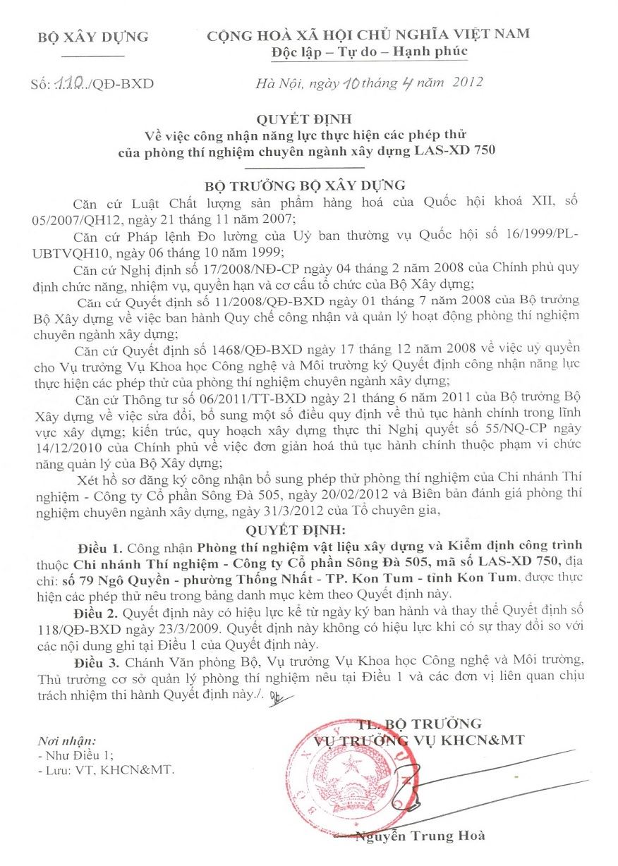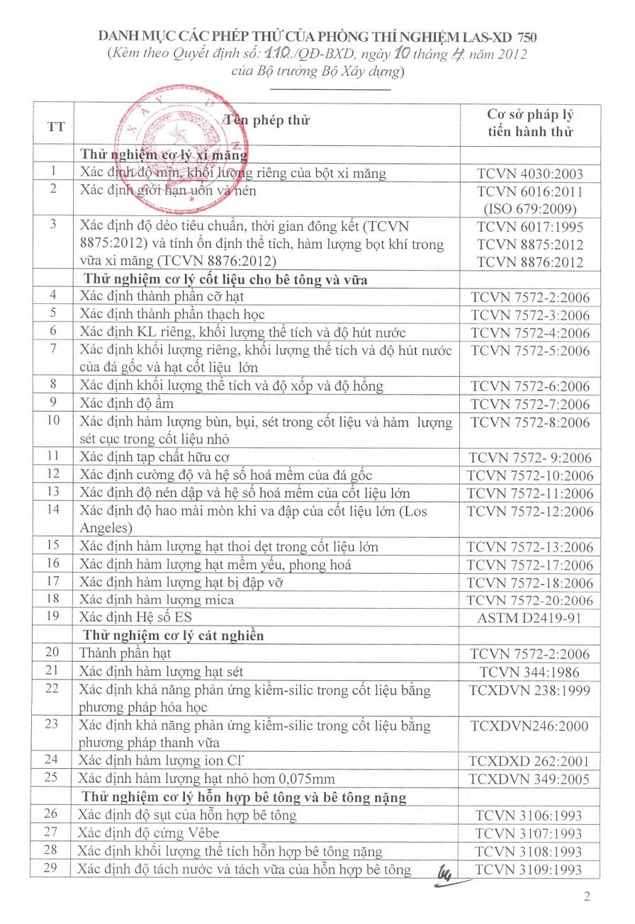 Chi nhánh thí nghiệm được Bộ xây dựng công nhận năng lực cho 22 lĩnh vực với 179 chỉ tiêu theo quyết định số 110/QĐ-BXD ngày 10/04/2012 của Bộ xây dựng.